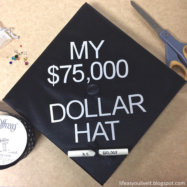 I used my beloved silhouette portrait to cut out the words "MY $75,000 DOLLAR HAT" onto a metallic card stock that shimmered. Unfortunately, it doesn't look very shimmery here. Obviously, this hat is very customizable and you can put whatever outrageous number that you spent on your education on it. Let me explain myself by saying that $75,000 was an estimate of my expenses over the past 5 years. It includes what I paid in cash for my tuition, any loans, books, etc. Thankfully, the loans I have yet to pay off are a little less that 1/4 of this number. PUT MONEY TOWARDS YOUR LOANS WHILE YOU'RE STILL IN SCHOOL, KIDS. If I were to include my cost of living expenses, the number would be a little lot higher. I didn't want to get too crazy.